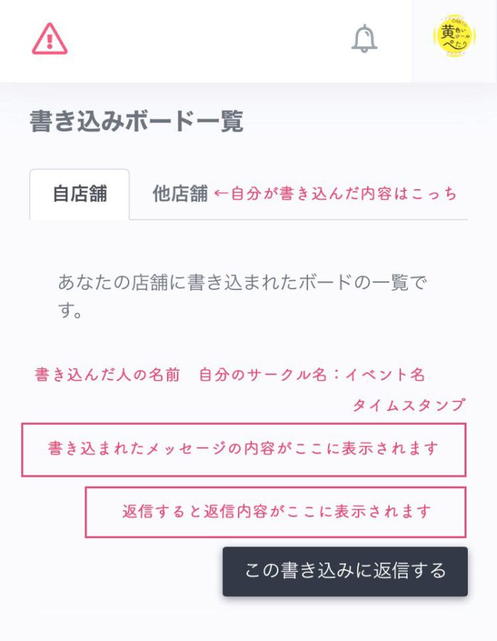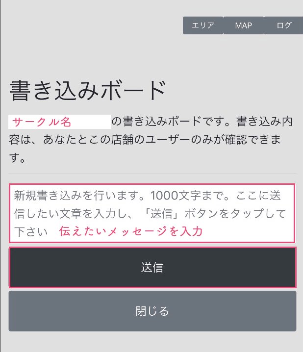 店舗の書き込みボードを使うことで、サークルへ個人的なメッセージを送ることができます。gifteeのURLを送ることも可能です。匿名ではなく、プロフで設定している名前が表示されます。