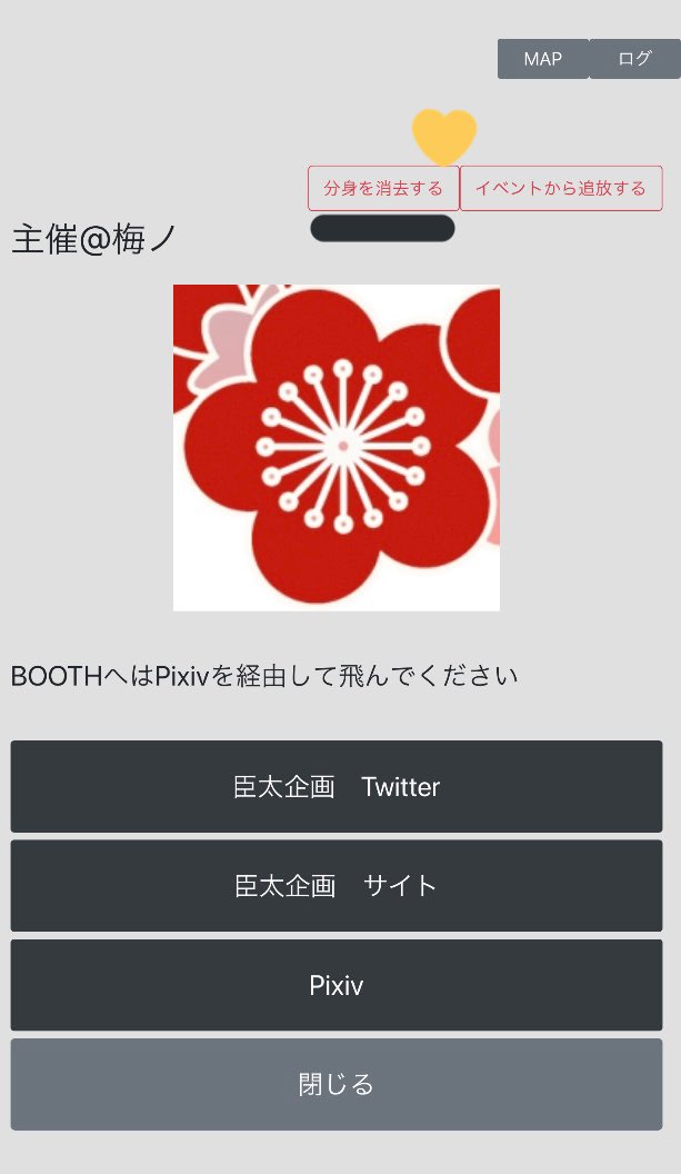 過去の自分のアバターが会場内のどこかに残っている場合、消したいアバターのプロフを開いて右上の「分身を消去する」を選べば消すことができます。