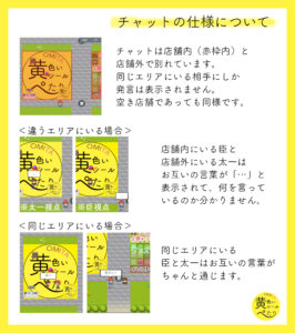 チャットは店舗内(画像赤枠内)と店舗外で別れています。同じエリアにいる相手にしか発言は表示されません。空き店舗であっても同様です。 話したい相手とは同じエリアにいるようにしましょう。店舗外では色々な人に発言が見えますのでご注意ください。